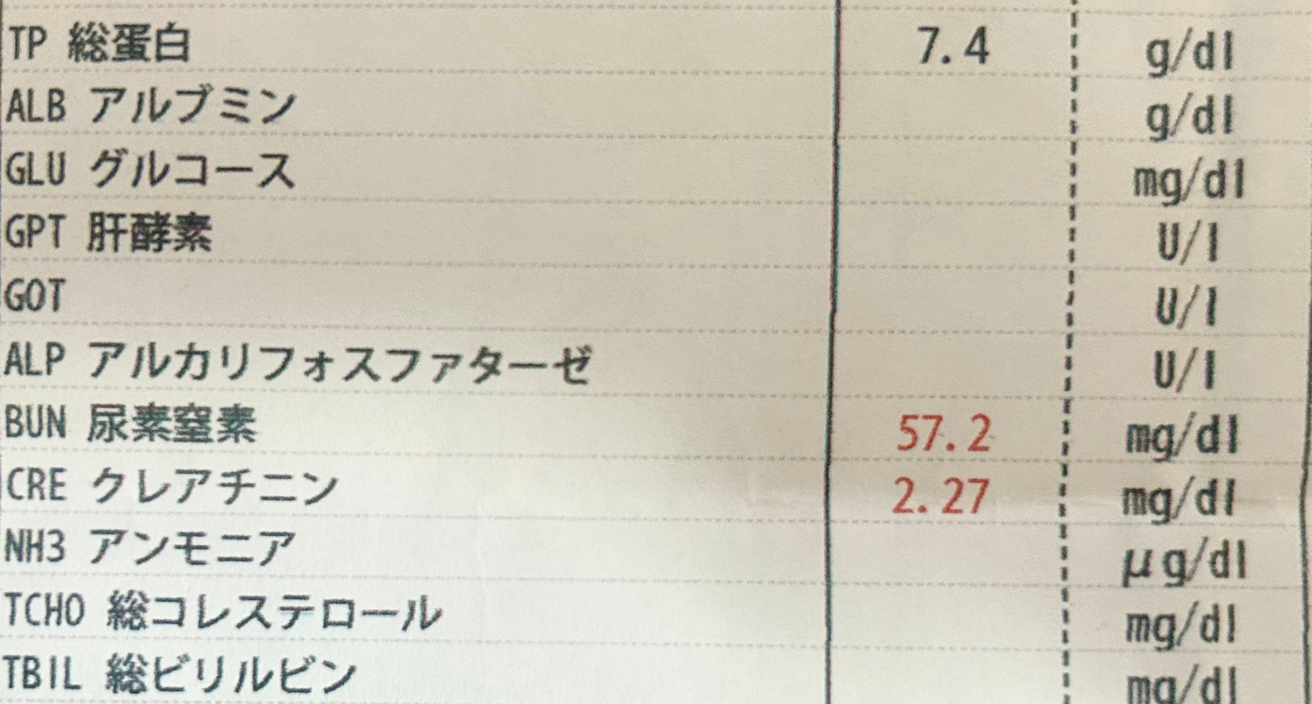 血液検査の結果,クレアチニンが2.27でやや悪化傾向であるものの前回と比べてほぼ横ばいでした。